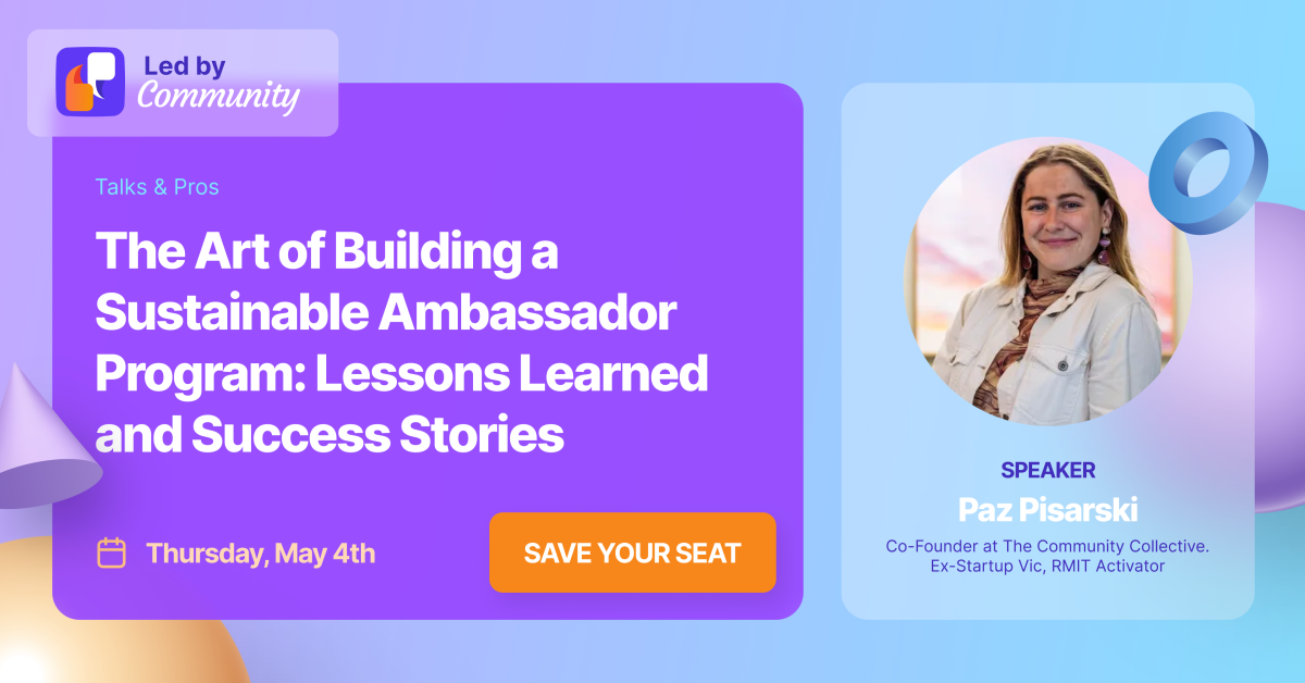 ๐๏ธ May 4th, The Art of Building Sustainable Ambassador Program: Lessons Learned and Success Stories with Paz Pisarski, Co-Founder at the Community Collective. Event by: Led by Community. Save your spot